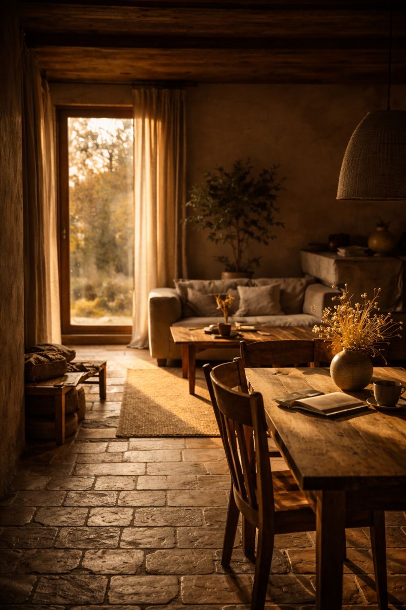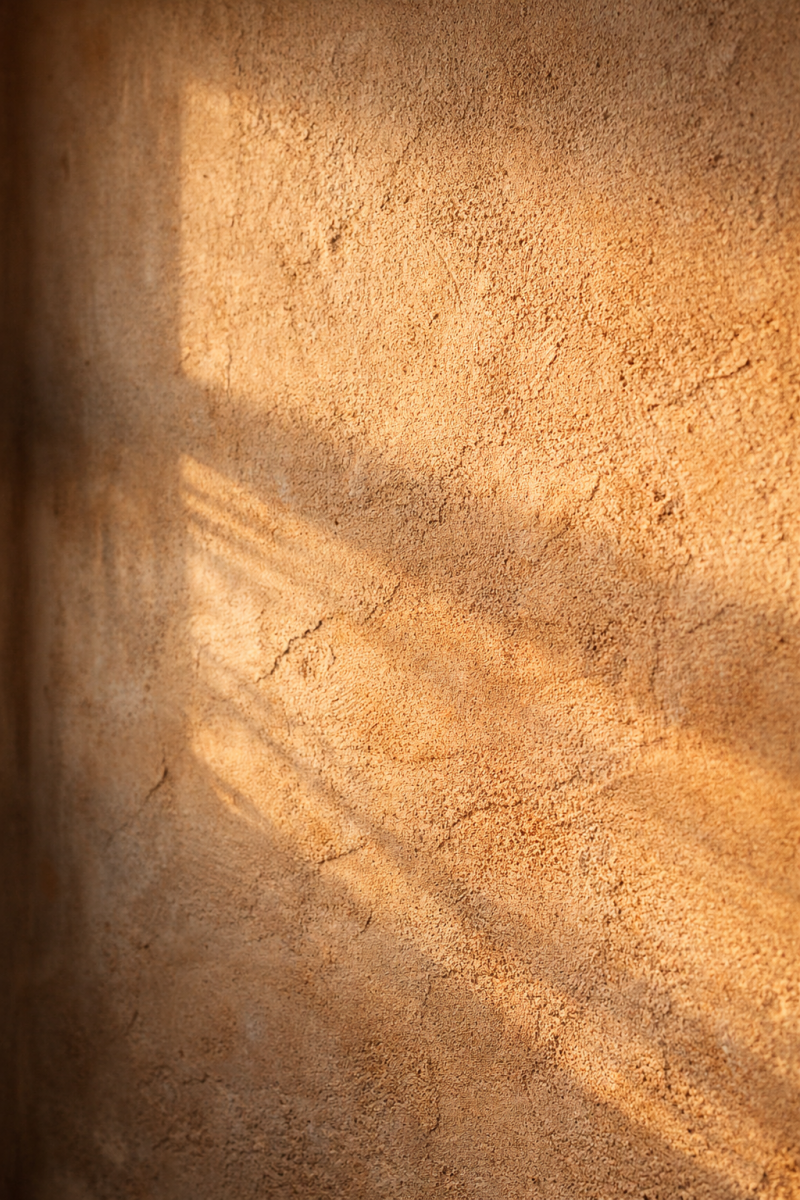 Avvicinati ai materiali: guarda come la luce fa risaltare un intonaco naturale o un piano in legno.